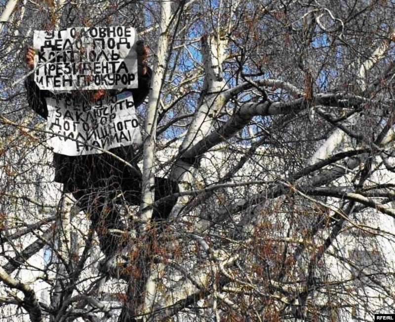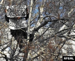 Выпускник детдома Анатолий Романов проводит акцию протеста на дереве, требуя выделить ему социальную квартиру. Уральск, 26 февраля 2009 года.