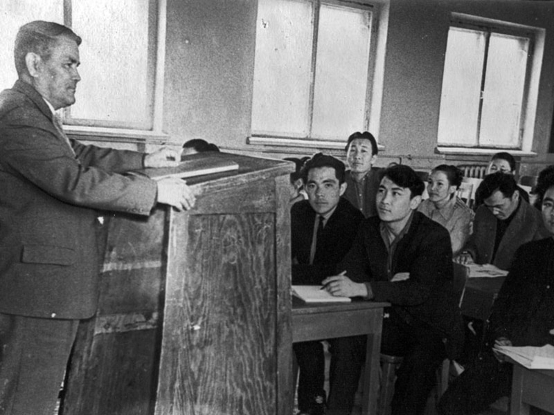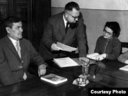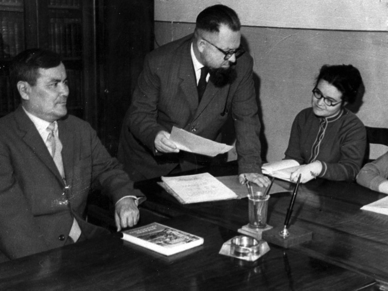 Казахский ученый Ермухан Бекмаханов в издательстве «Мектеп». Идет обсуждение школьного учебника по истории Казахстан. Алматы, 1959 год.