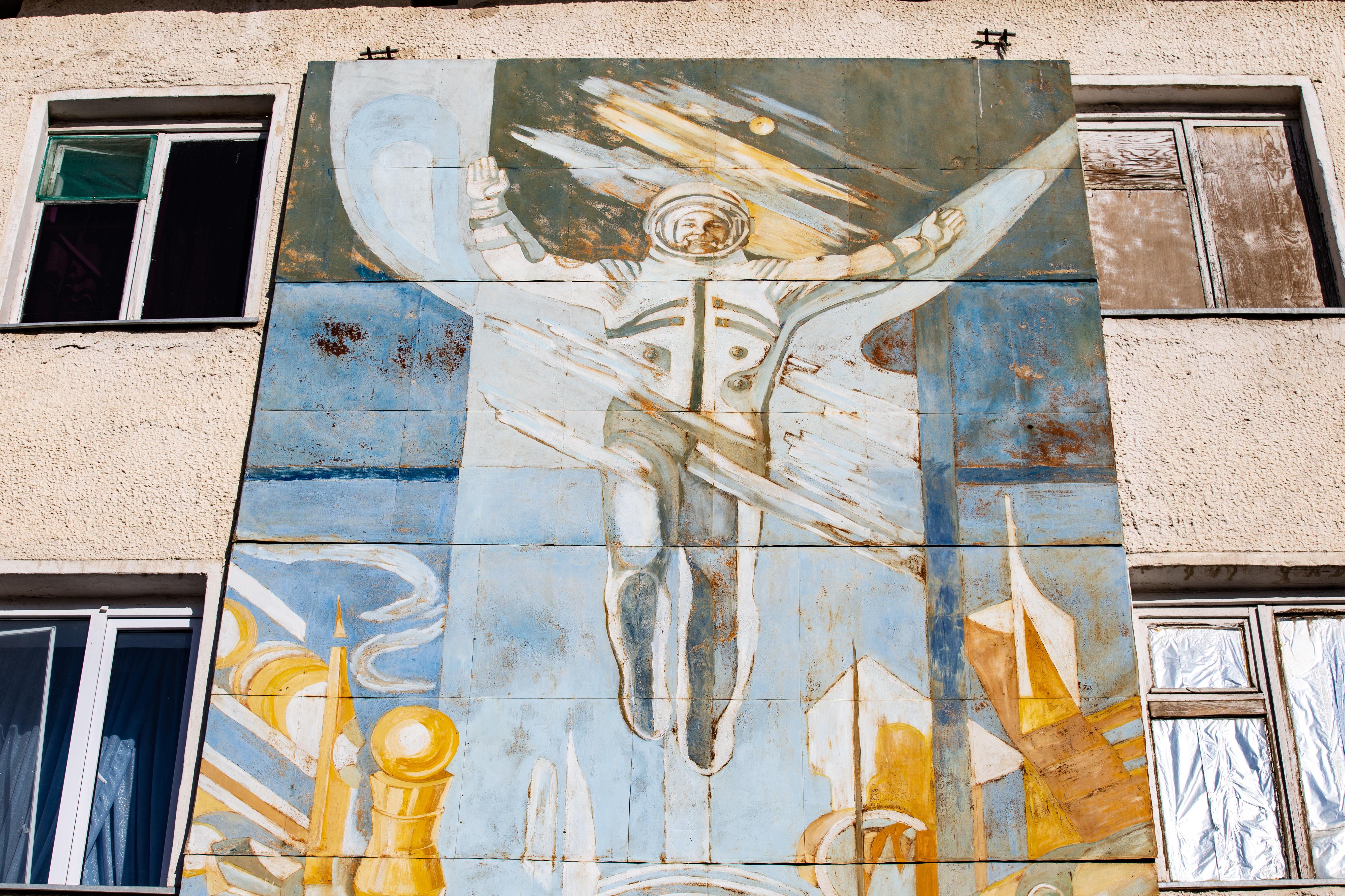 Изображение космонавта на стене дома. Байконур, 15 марта 2019 года.